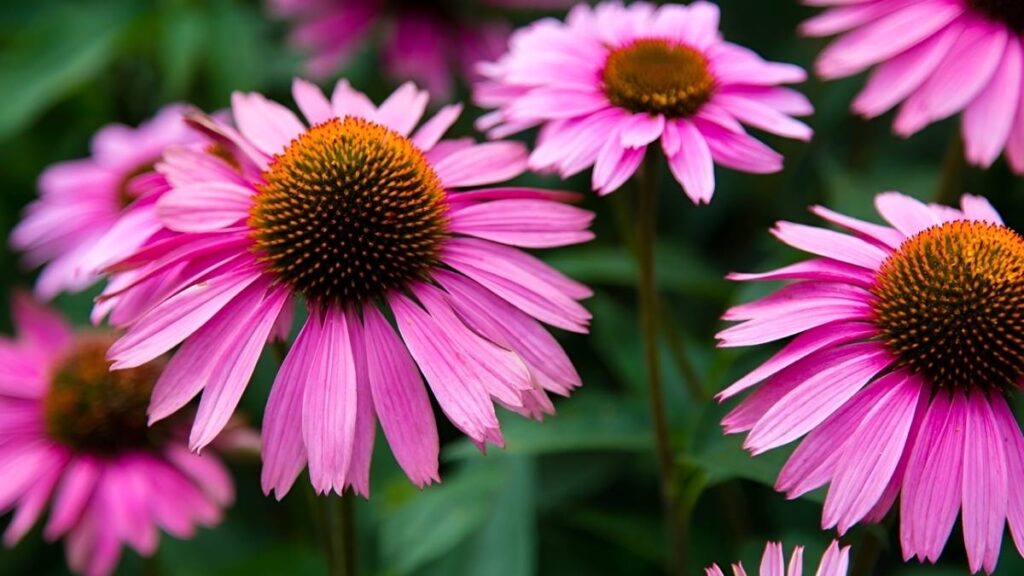 Coneflowers are popular perennials that bring a splash of color with their distinctive daisy-like blooms. They grow best in full sun but tolerate some shade. Coneflowers are drought-resistant once established and do not require frequent watering.