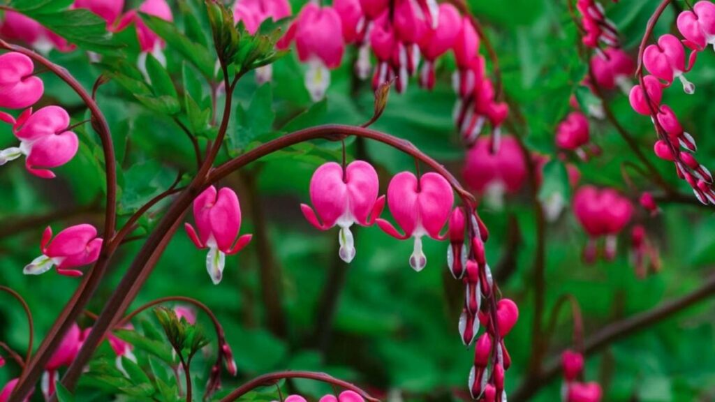 Bleeding hearts are one of the most romantic and recognizable plants in any shaded garden. Their arching stems bear rows of delicate, heart-shaped flowers in shades of pink or white, often blooming in late spring to early summer.